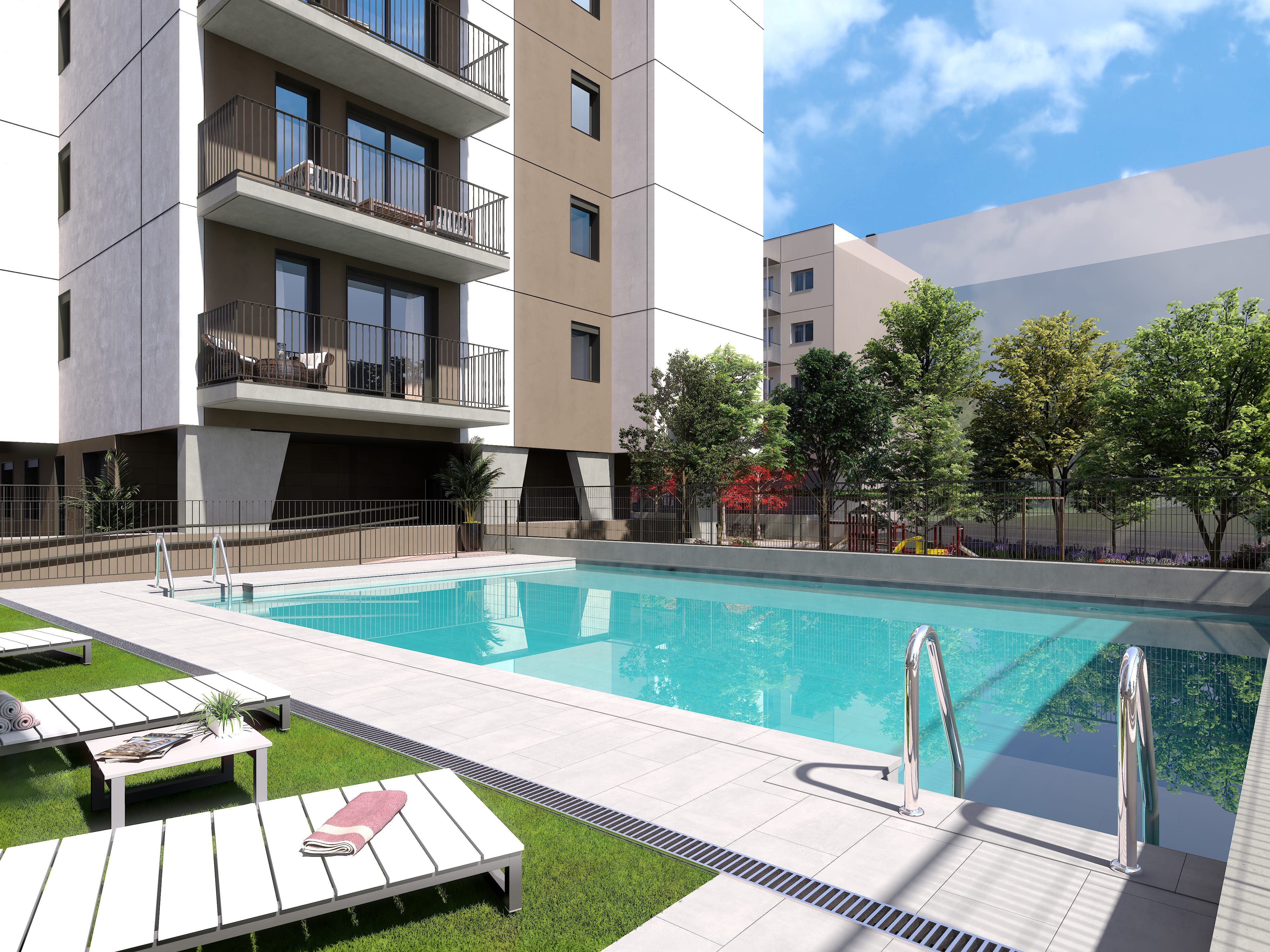 Por ello, el proyecto incluye piscina comunitaria, espacios al aire libre para el descanso y el ocio, así como parking de bicicletas. Todo ello en un entorno pensado para compartir momentos, desconectar y disfrutar del tiempo libre sin salir de casa.